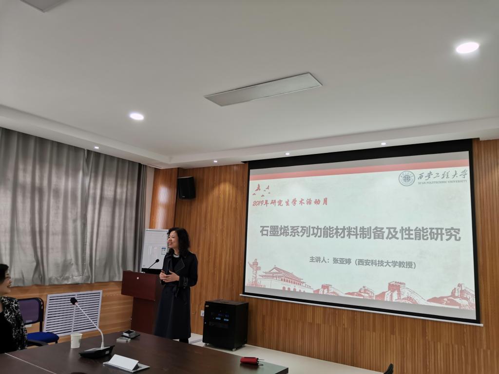 2019年11月7日下午,suncity太阳新城在507会议室举办了2019年研究生学术活动月活动,邀请西安科技大学教授张亚婷作了题为“石墨烯系列功能材料制备及性能研究”的学术报告。suncity太阳新城研一、研二学生参加了本次报告,报告会由学院副院长常薇主持。