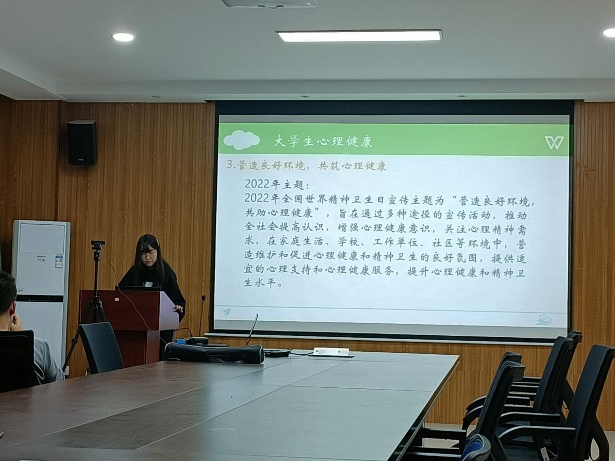 乔依涵首先介绍了精神卫生日由来和国家对精神卫生日的重视。随后用生动形象的举例来说明开展心理健康教育的必要性;紧接着郭登宇向同学们讲解了大学生心理健康影响因素事例和心理健康评判标准,方便各位同学进行自评自测;最后给大家介绍了在当今严峻的疫情形式下,我们大学生如何缓解焦虑,正确的调整自己的状态来应对接下来的课程学习。