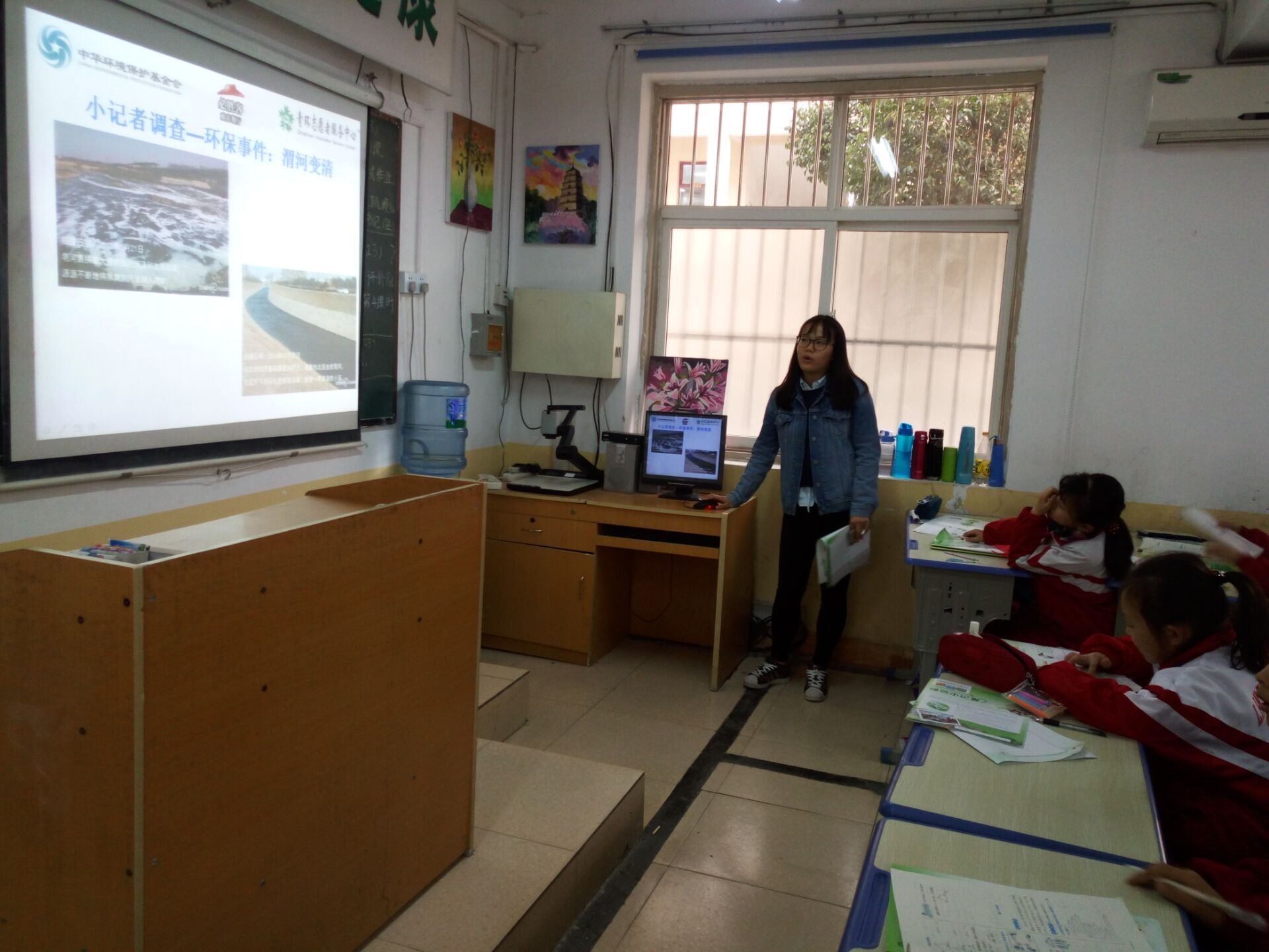 35分钟的“小记者”课堂上,志愿者们通过PPT展示、朗读课本相关段落、举手提问、游戏互动等环节带领小朋友们简单的认识了环境现况,并倡导小朋友们加入环保小记者的行列,关注身边的环保小事件。