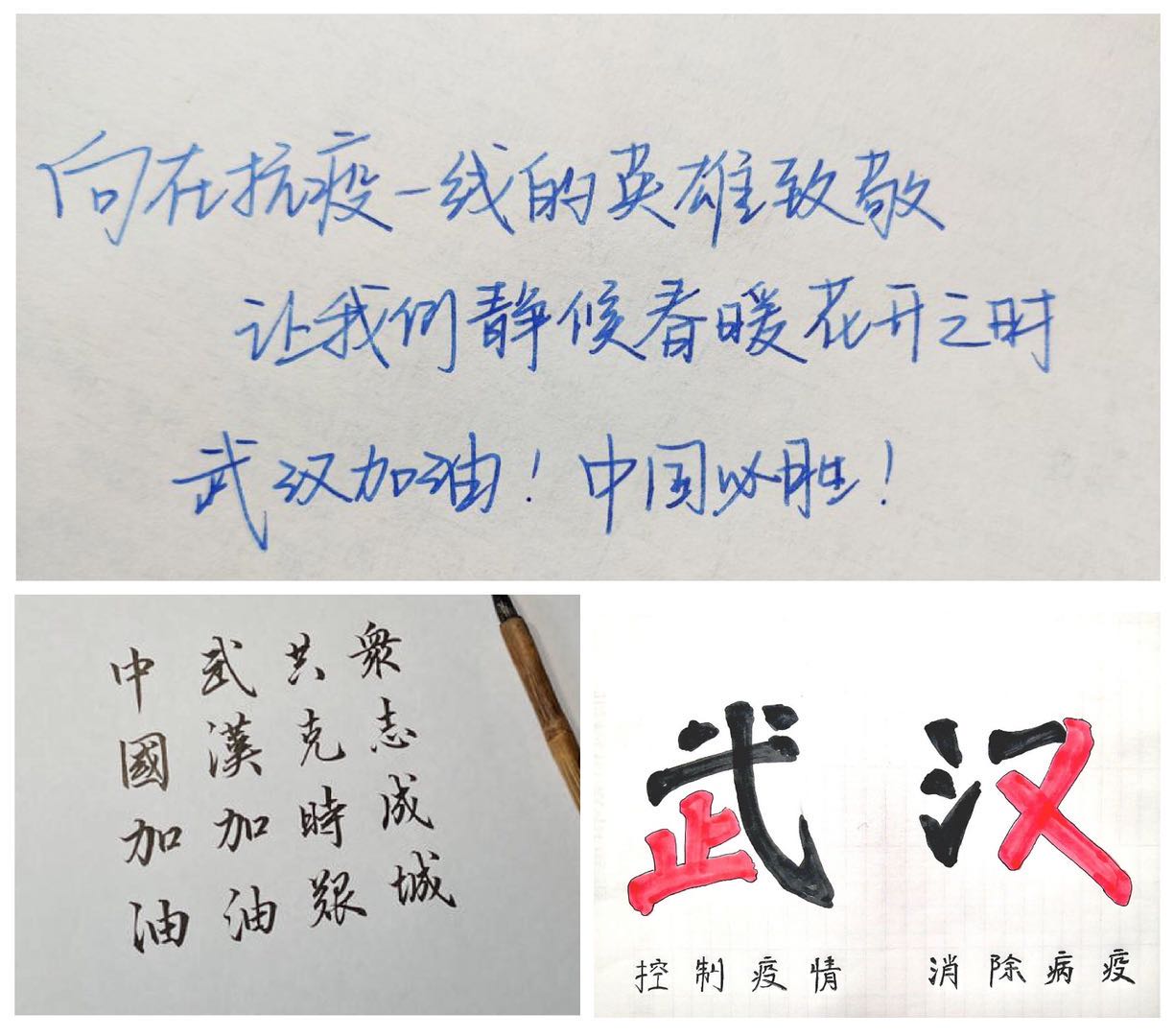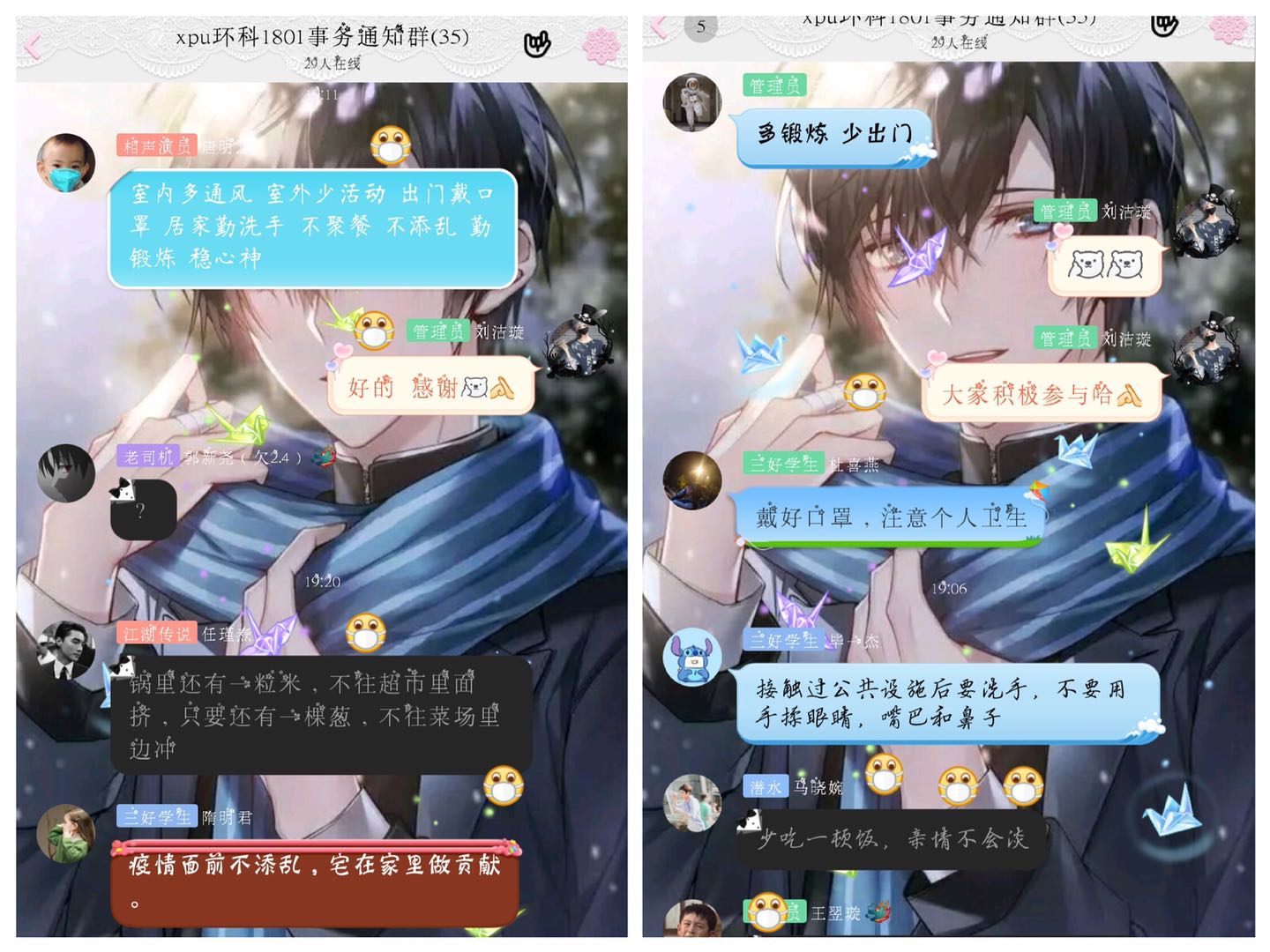 强化思想引领,筑牢抗疫防线。学院充分发挥网络育人优势,强化学生思想引领。一是通过视频会议等方式,带领学生学习我们疫情防控期间各项通知要求、《教育部致大学生的一封信》等,引导学生科学防疫,增强责任意识;二是辅导员、班主任加入学生课程学习群,协助任课老师督促学生按时上课,并组织线上“英语学习打卡”等活动,营造“好学、争先”的良好氛围,强化学习意识;三是通过微信公众平台、QQ群、微信群等方式发送疾病预防的方法和手段,告诫学生严格遵守当地政策,不出门、少出门,切实提高学生安全意识;四是组织各团支部开展以“疫情防控,从我做起”、“致敬最美逆行者”为主题的线上班团活动,鼓励学生参加第二课堂阅读活动。学院学生创作了主题文章、绘画、手幅寄语、《武汉伢》等抗疫相关文化产品,致敬抗疫英雄,助力抗疫一线,增强战胜疫情的坚定信心。