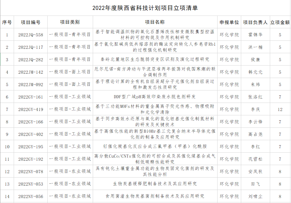 日前,陕西省科技厅公布了2022年度陕西省科技计划项目立项结果,我们共获批14项,占全校获批总数的16.7%,其中:青年项目3项;面上项目2项;工业领域6项;农业领域3项。立项金额:96万元。