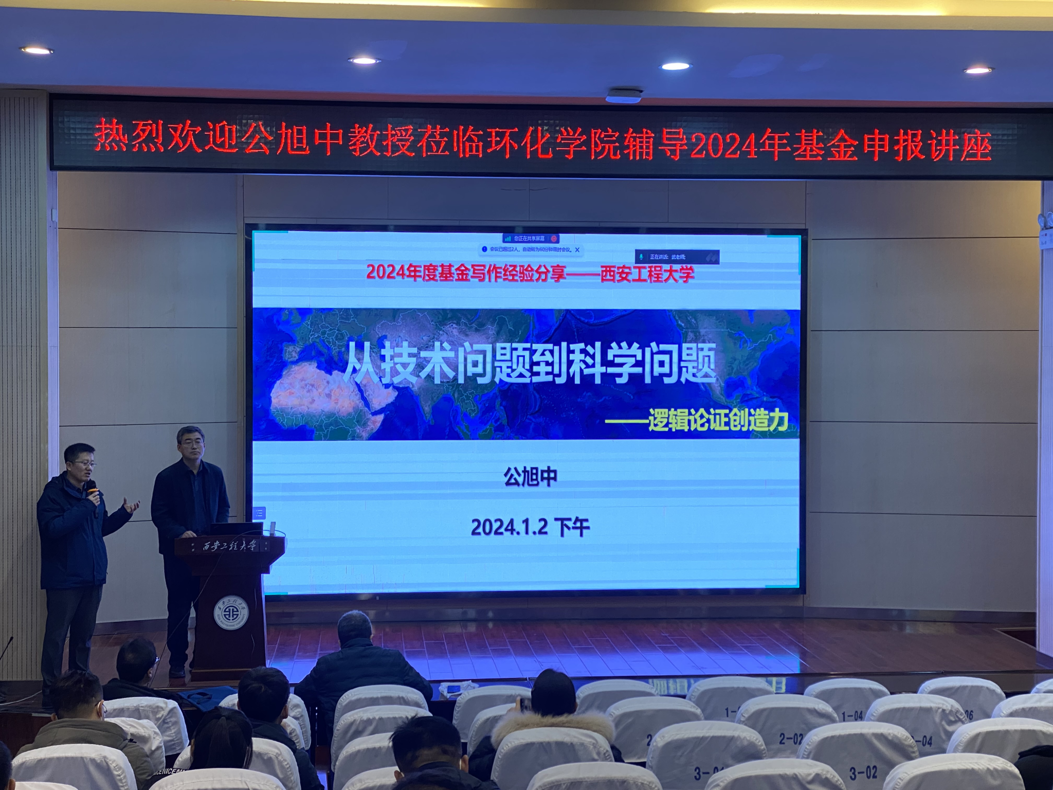 为提高我们2024年国家自然科学基金申报质量,1月2号下午,在金花校区西纺报告厅,我们特邀中国科学院过程工程研究所公旭中教授作题为“从技术问题到科学问题——逻辑论证创造力”的国家基金申报辅导讲座。学院2024年国家基金申报教师及科研骨干五十余人线上线下同步参加。讲座由主持工作副院长武占省教授主持。