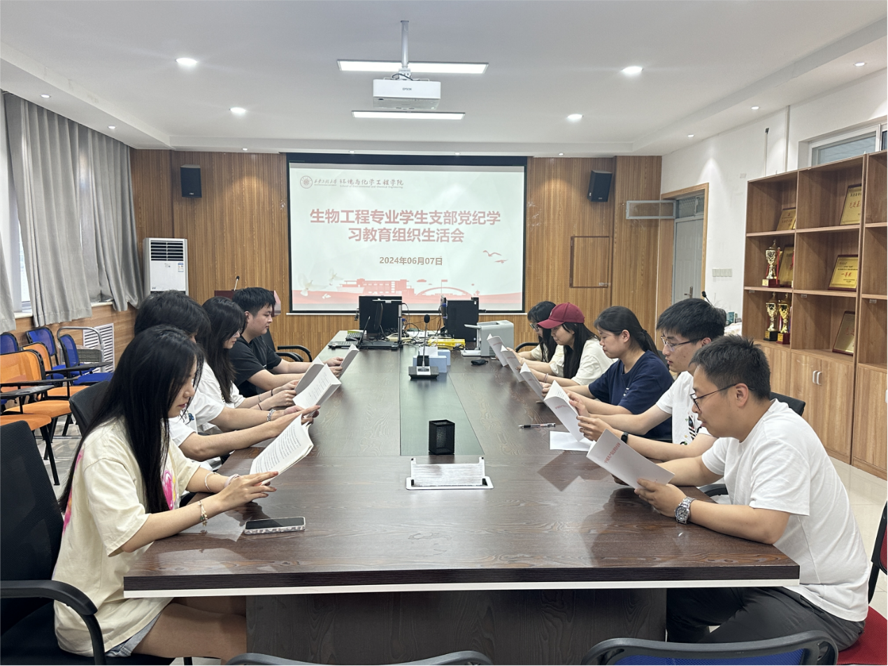 首先,支部书记刘啸尘再次强调了党纪学习教育的重要性和必要性。随后,支部党员通过党纪学习教育短片《中国共产党纪律处分条例解读》,围绕《中国共产党纪律处分条例》的本次修订内容、本次修订的意义和新修订《条例》内容的解读等展开深入学习。最后,生物工程专业学生党支部党员集体学习了《中国共产党纪律处分条例》的总则部分,并开展了交流讨论。大家表示:大学生党员作为青年群体中的先锋队伍,要主动对标党纪学习教育的目标要求,通过学纪、知纪、明纪、守纪,筑牢思想防线,始终做到政治自觉、思想自觉和行动自觉。生物工程专业学生党支部党员已经深刻认识开展党纪学习教育的重大意义,以后会坚持用党规党纪校正思想和行动。