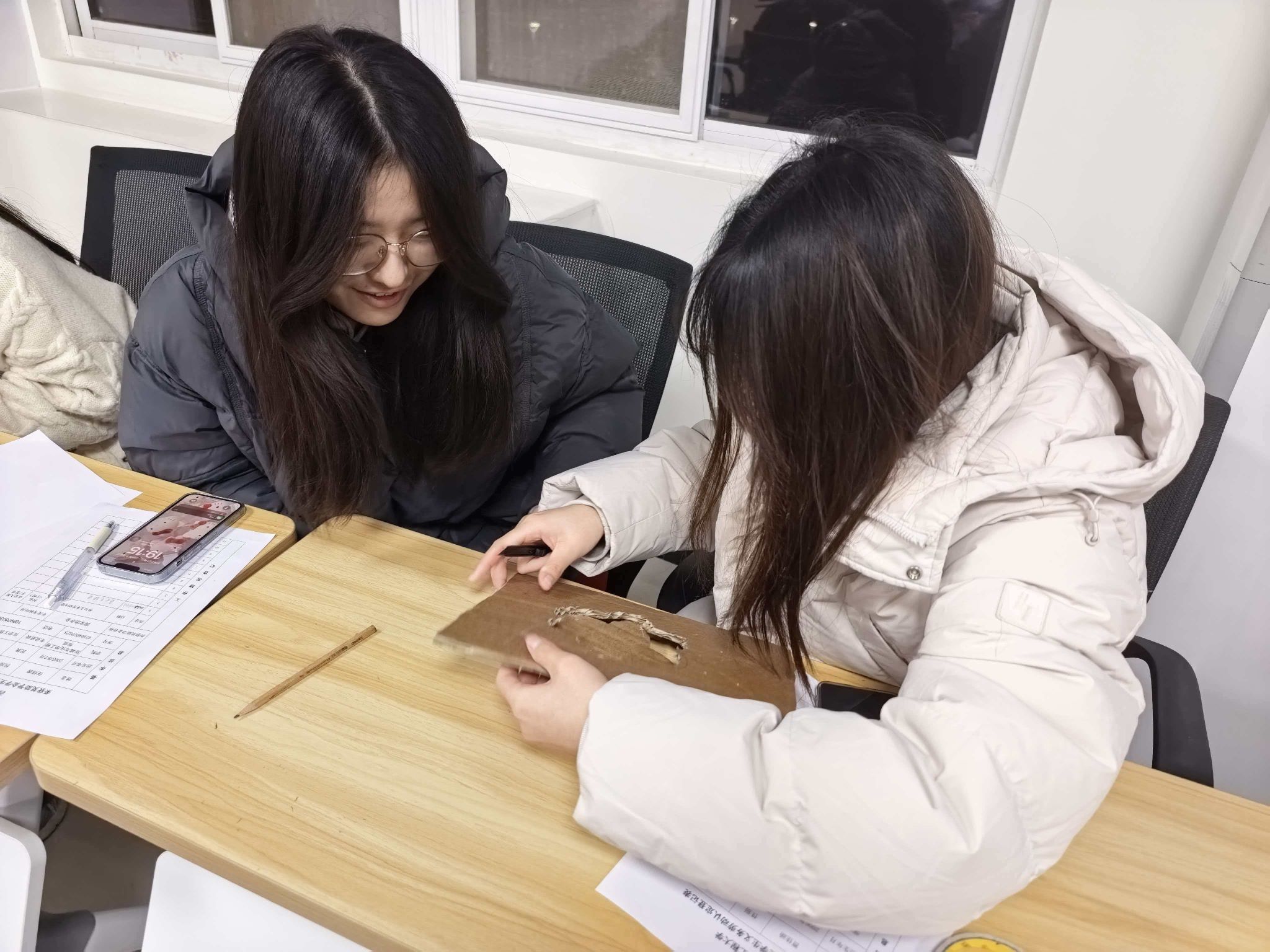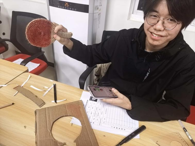 随后,手工小导师张博现场演示了以旧纸盒、麻绳等为基础制作杯垫的具体方法。同学们纷纷动手,将提前收集的纸盒进行裁剪、编织与装饰。创作中大家各展巧思,作品形式多样:有的将杯垫设计成乒乓球拍形状,融运动情怀于环保实践;有的以水果为灵感,为作品增添生活趣味;还有的制作出星星、时钟等造型。每一件作品既承载着手工的温情与创意,也成为绿色生活方式的生动体现。