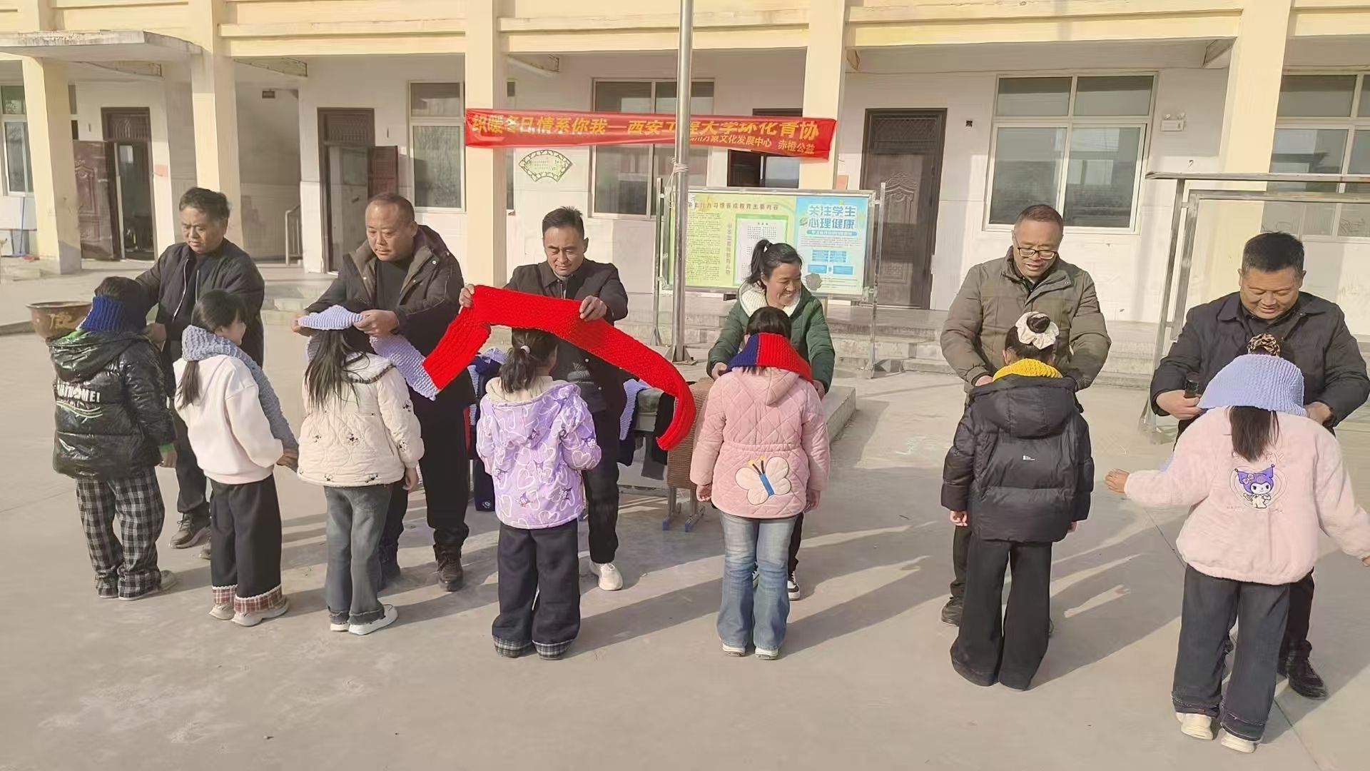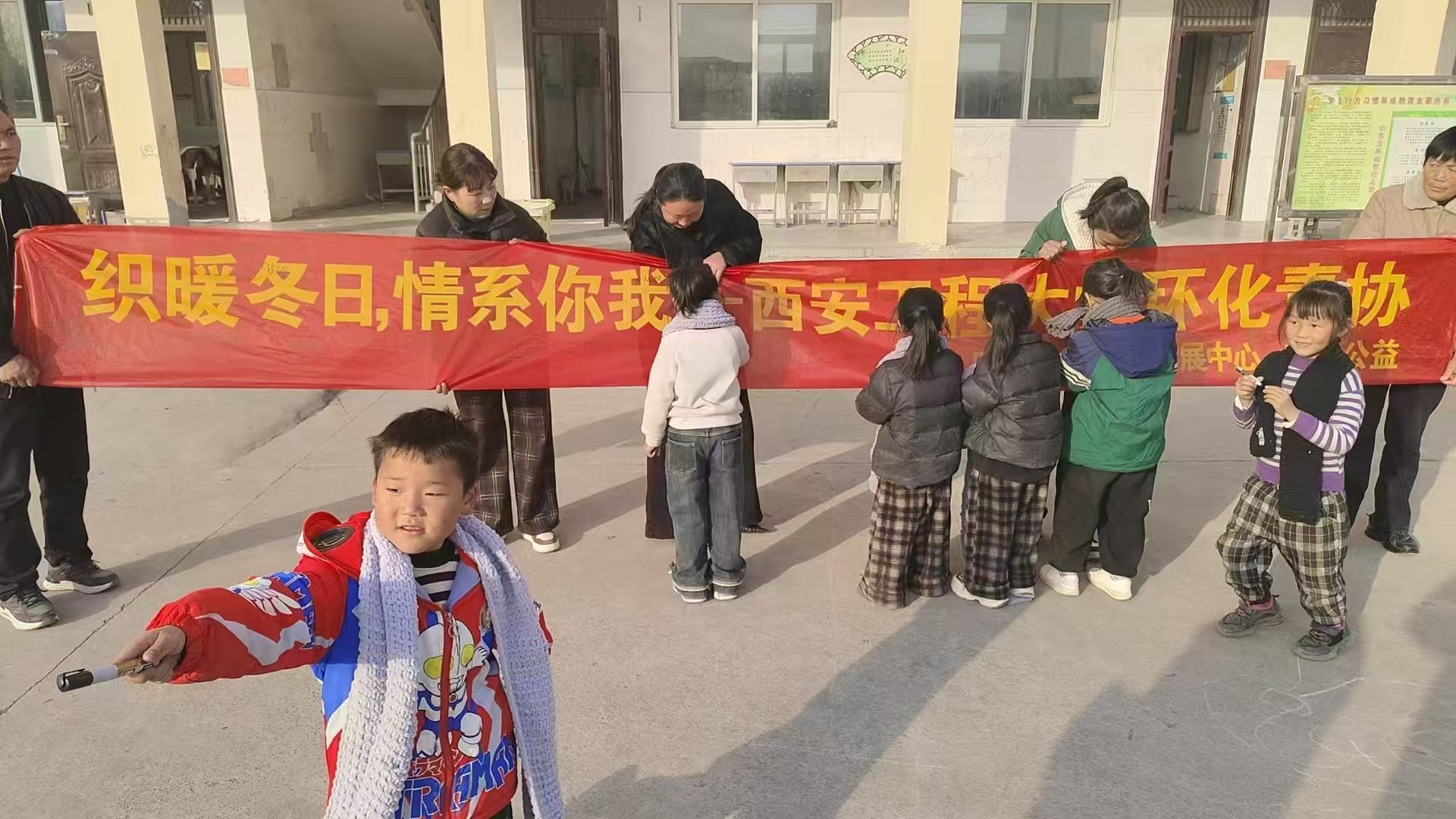 12月2日,活动的高潮在乡村小学的操场上上演。志愿者们与孩子们共同展开“织暖冬日,情系你我一一suncitygroup太阳官方网站环化青协”的红色横幅,冬日的阳光洒在每个人的笑脸上。当鲜红的围巾被轻轻围上孩子的脖颈,当柔软的毛线帽被戴在头上,操场上响起阵阵欢笑。孩子们戴着新围巾,围成一圈,收到我们的善意,孩子们纯真的笑脸如同绽放的花朵。