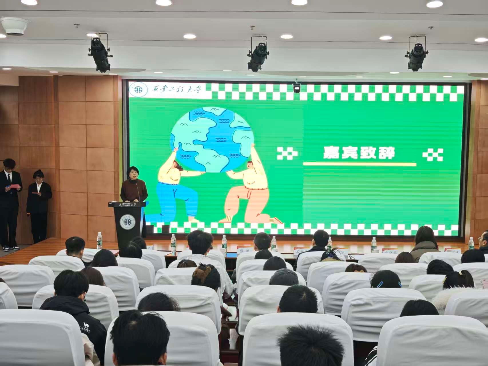 本次活动,旨在通过创意设计传递环保理念,凝聚志愿力量,为陕西省环保志愿者联合会设计志愿者马甲。自活动启动以来,吸引了全校各院学子积极参与,经过前期严格评审,共有9支队伍进入决赛。在作品展示环节,9支团队依次登台,围绕“环保初心与志愿担当”主题,系统阐述了设计理念与创意特色,参赛作品风格多元、构思巧妙,选手们通过设计让环保理念可知可感,体现了青年一代对生态文明与志愿精神的深刻体认。