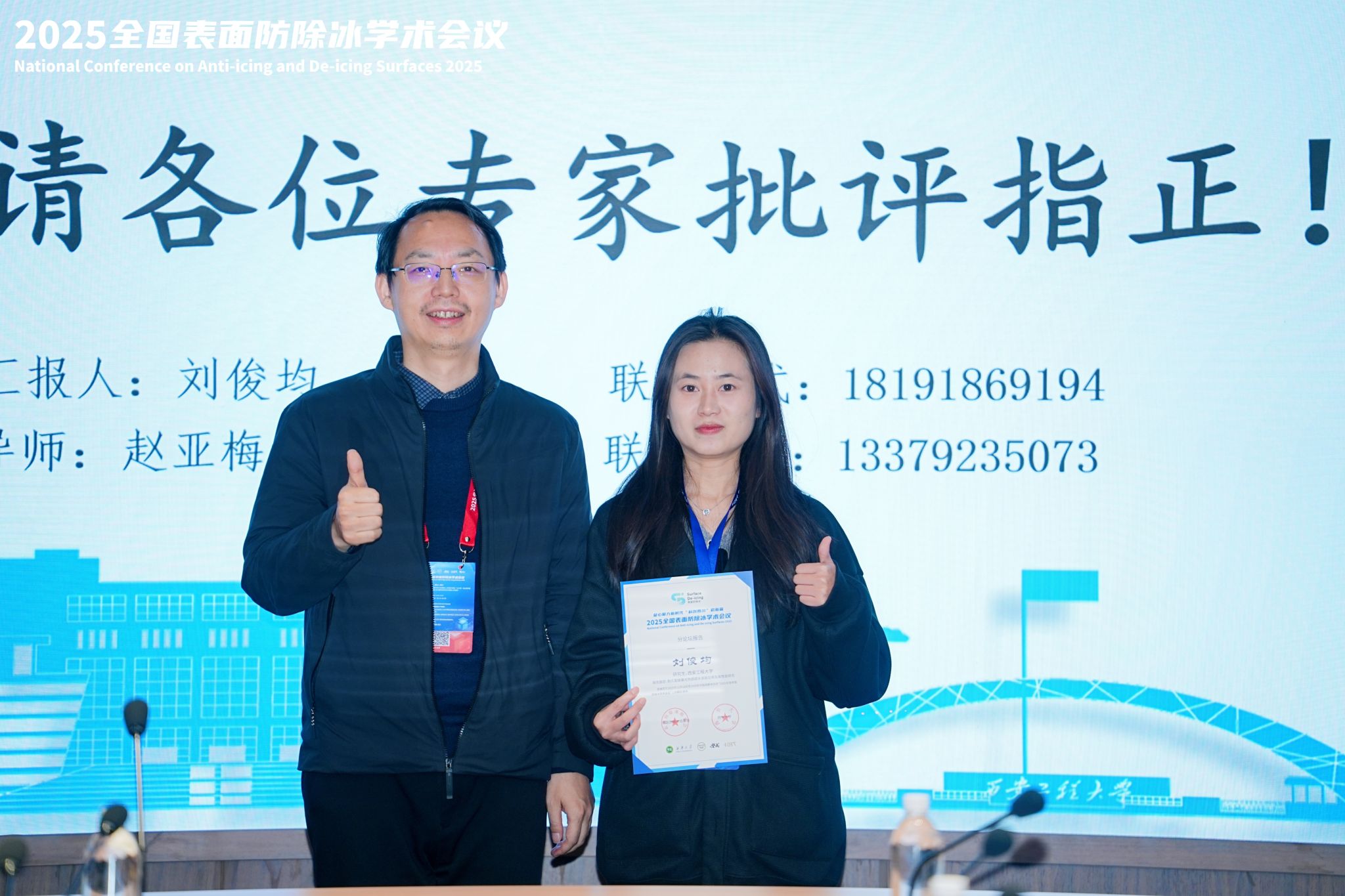 赵亚梅教授受邀主持分会场,以“超疏水表面构建的功能化与应用性初探”为题,介绍超疏水表面构建思路、方法、性能提升途径及课题组2025年最新研究成果,并与专家、学者深入交流讨论。刘俊均同学在分论坛中,以“耐久型碳基光热超疏水的应用及其性能研究”为题,汇报了耐久型碳基光热超疏水材料技术优势、制备工艺与性能优化策略,以及该材料在金属表面防结冰等研究进展,积极交流学习,展现我们研究生良好精神风貌、科研能力和综合素养。